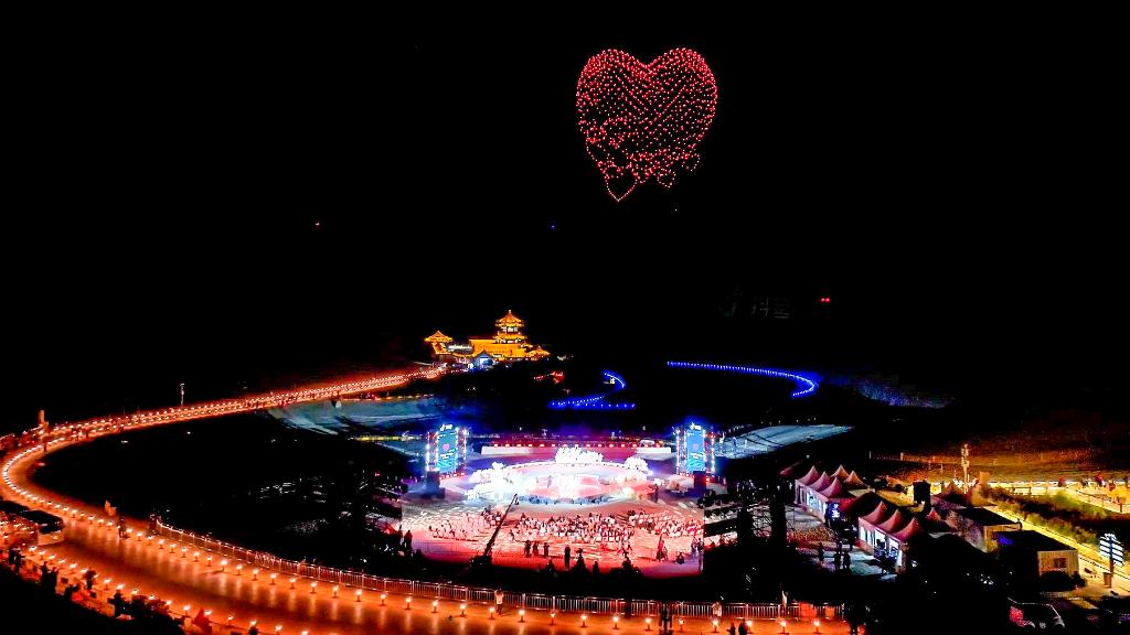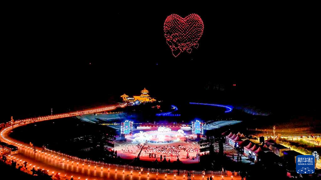 夜色渐浓,1500多架无人机从鸣沙山顶腾空而起,依次变幻出红心、生日蛋糕等璀璨图样,为祖国华诞献上深情祝福。数万名游客在星空下挥舞荧光棒与手机灯光,齐声高唱《我爱你中国》,将现场氛围推向高潮。