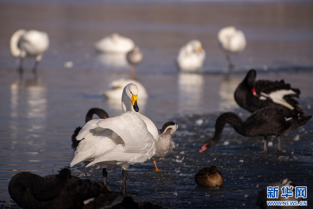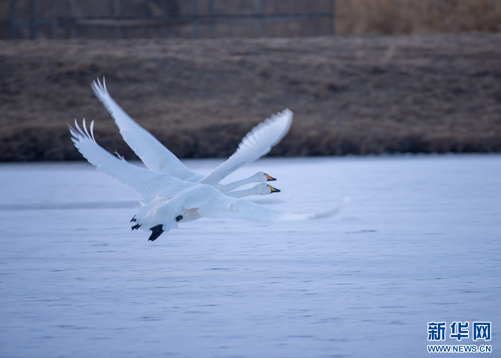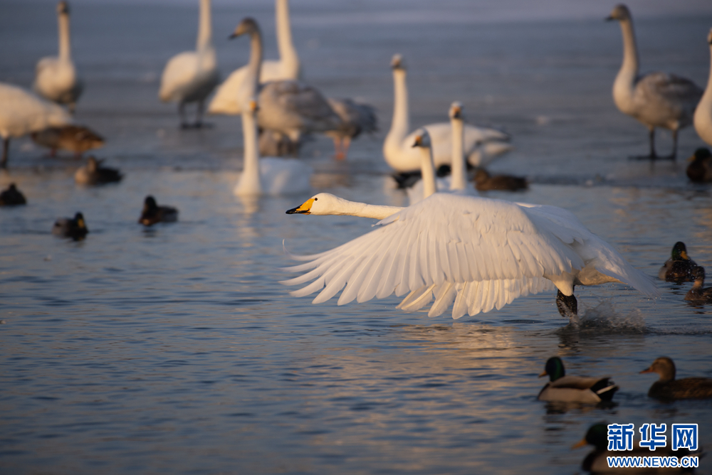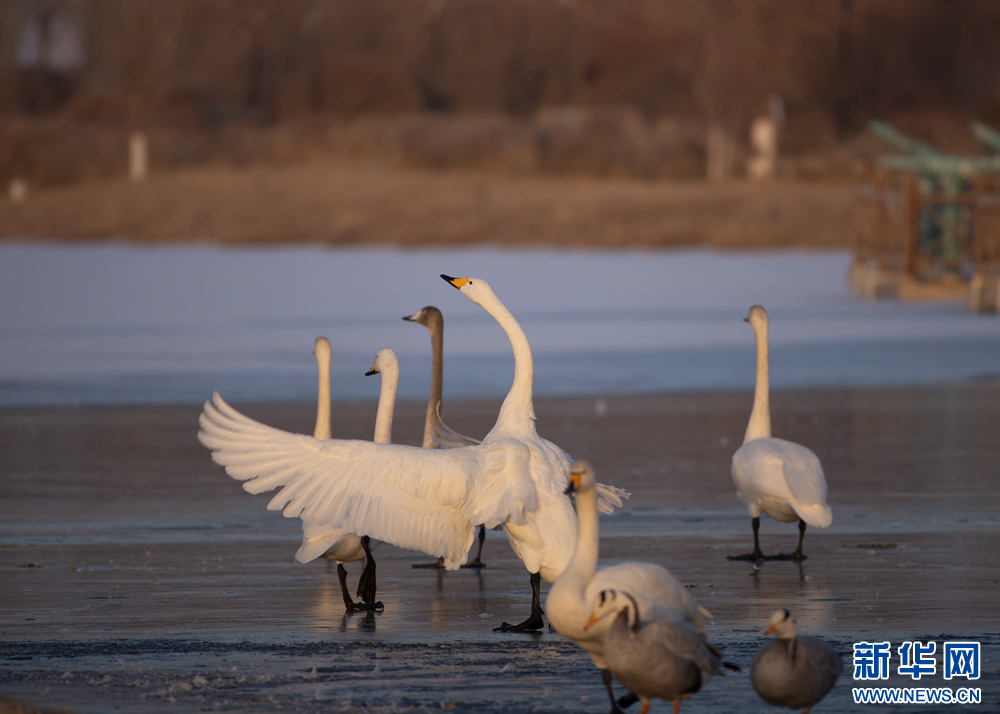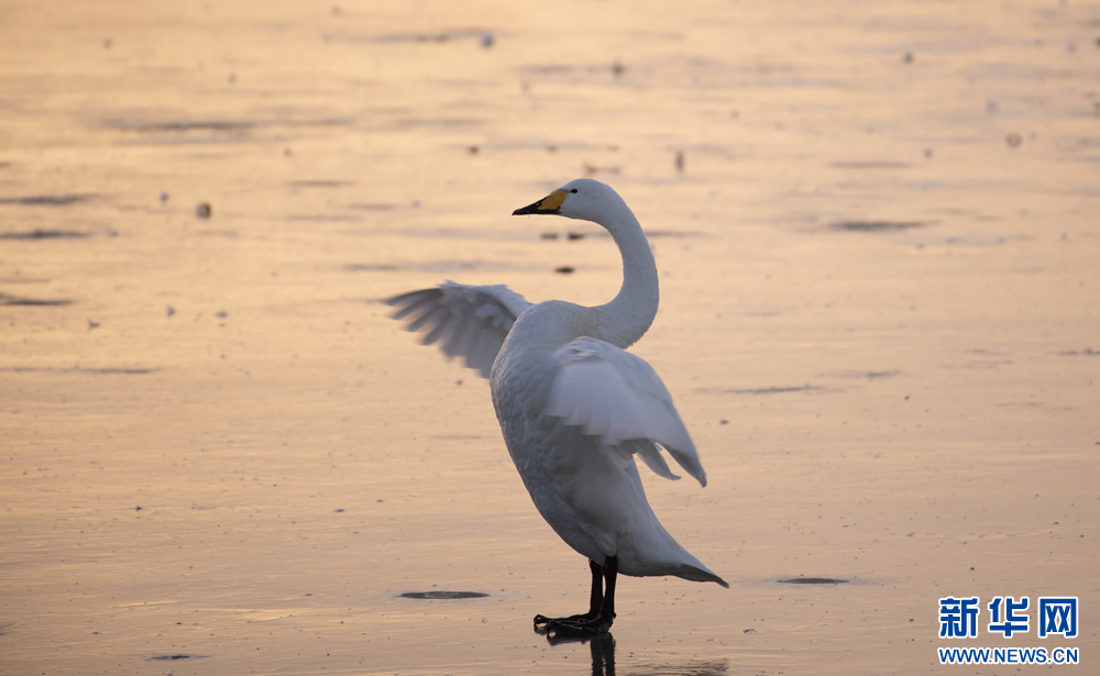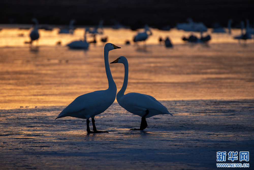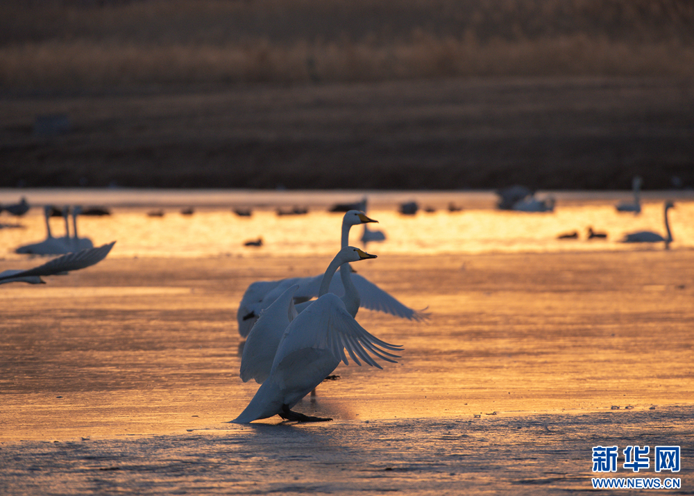 冬日的白天鹅在甘肃张掖国家湿地公园的夕阳下翩翩起舞,此起彼伏的鸣唱,柔美的身姿,在阳光里揉成一副金色画卷。新华网发(刘旭明 摄)