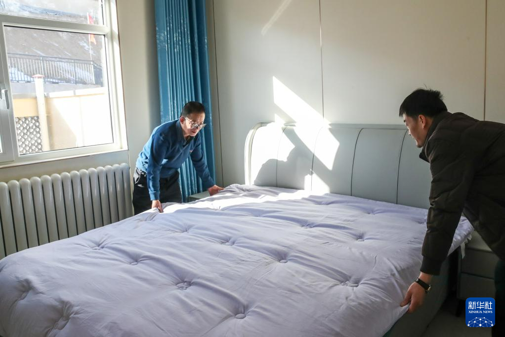 12月29日,村民张伦贤(右)在榆中县马坡乡马莲滩村集中安置点的新家里整理床铺。新华社记者 郎兵兵 摄