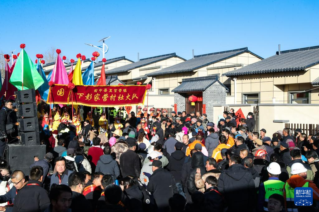 12月29日,社火队伍在榆中县马坡乡马莲滩村灾后重建集中搬迁入住活动现场表演。新华社记者 郎兵兵 摄