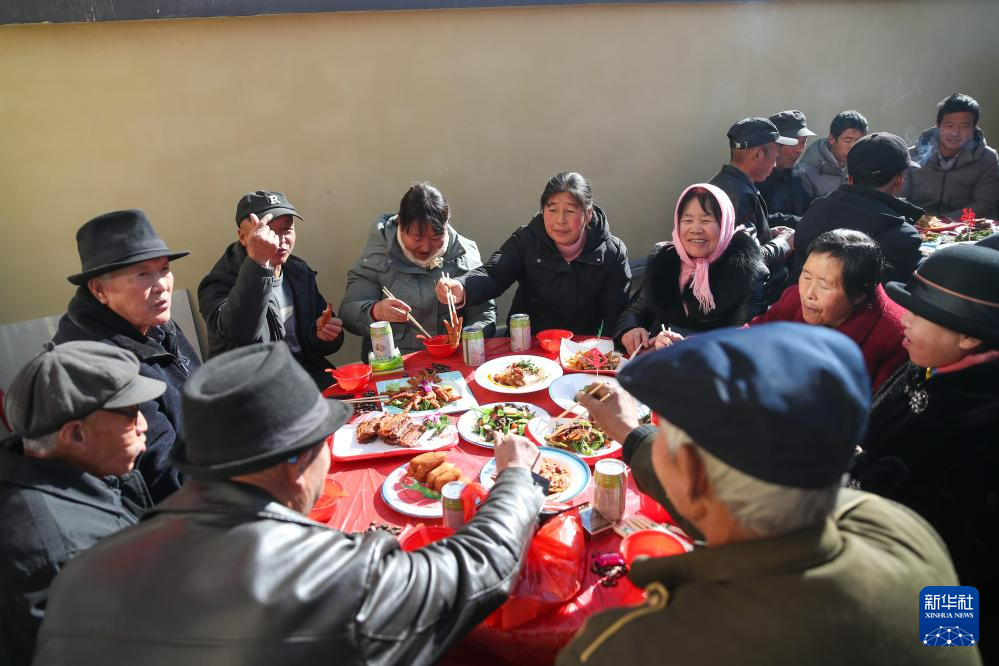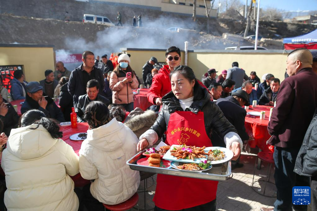 12月29日,村民在榆中县马坡乡马莲滩村集中安置点参加一场乔迁宴。新华社记者 郎兵兵 摄