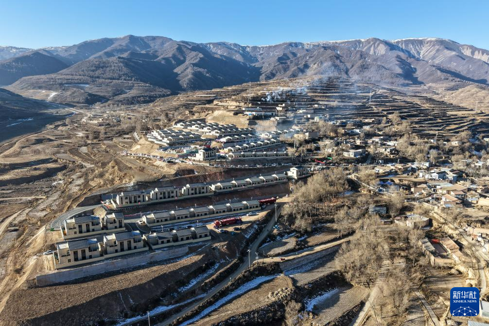 这是12月29日在榆中县马坡乡马莲滩村集中安置点拍摄的灾后重建集中搬迁入住活动现场(无人机照片)。新华社记者 郎兵兵 摄
