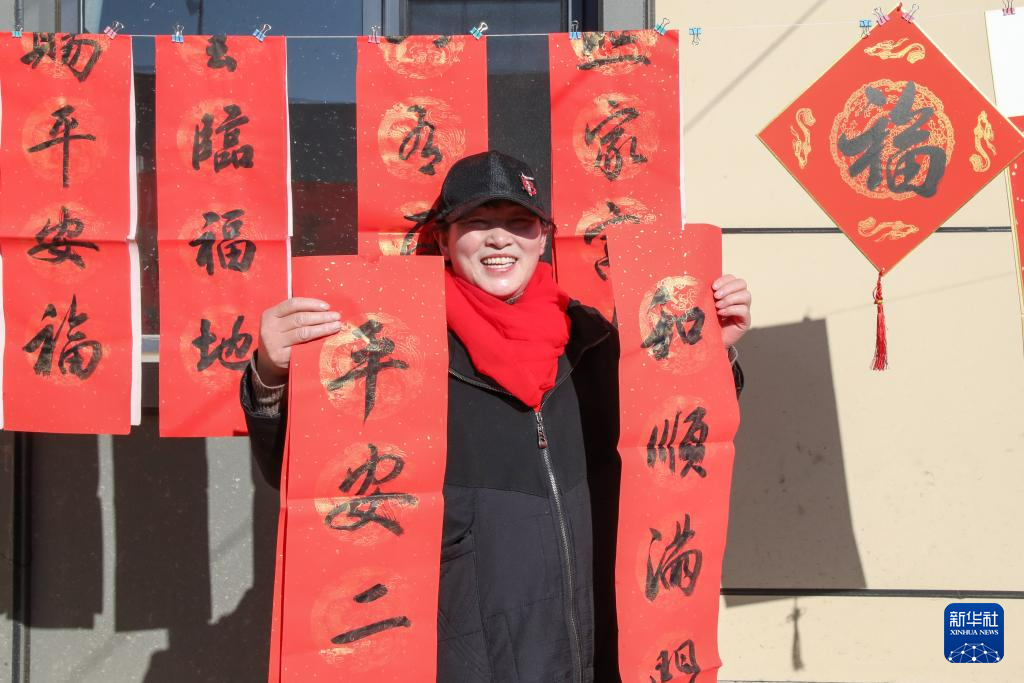 12月29日,村民在榆中县马坡乡马莲滩村灾后重建集中搬迁入住活动现场领取春联。新华社记者 郎兵兵 摄