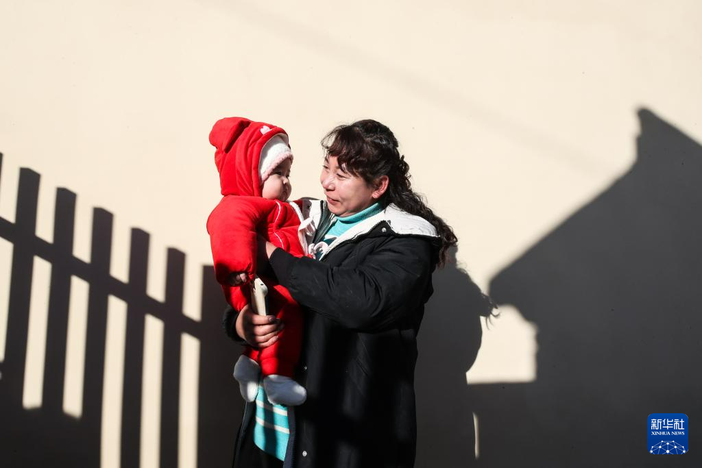 12月29日,村民抱着孙子在榆中县马坡乡马莲滩村集中安置点的新家晒太阳。新华社记者 郎兵兵 摄