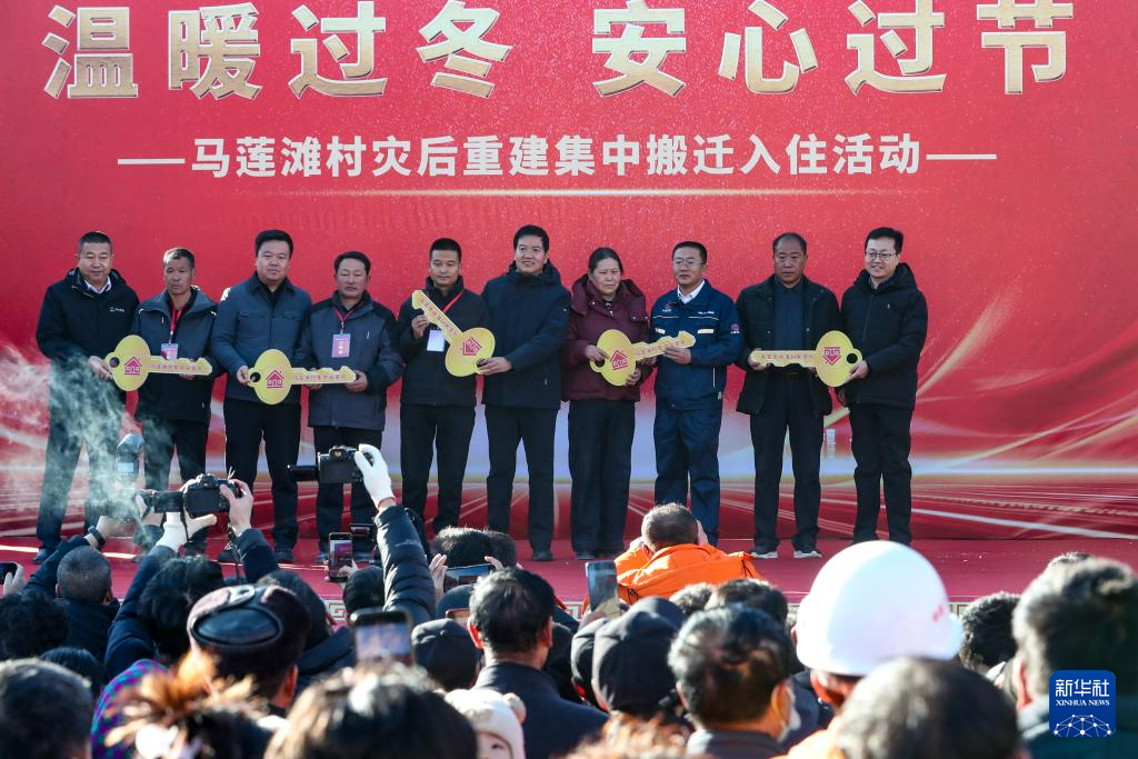 12月29日,在榆中县马坡乡马莲滩村灾后重建集中搬迁入住活动现场,建设单位代表与群众代表举行交付新房钥匙仪式。新华社记者 郎兵兵 摄