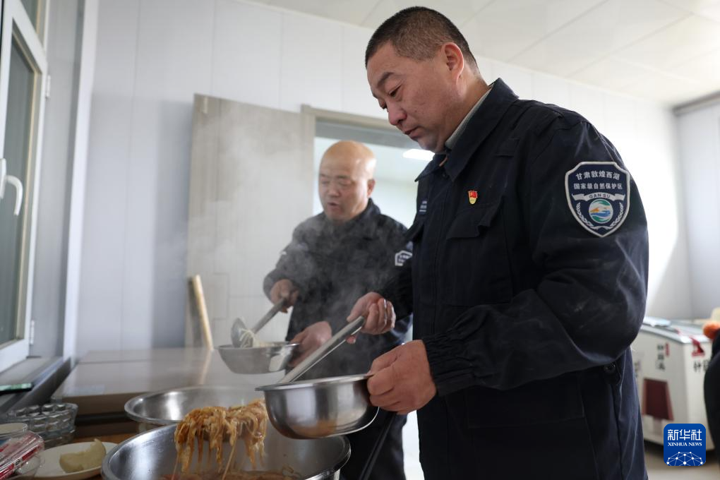 这是吴兴东(右)和同事在巡护结束后,回到站里吃饭。新华社记者陈斌 摄