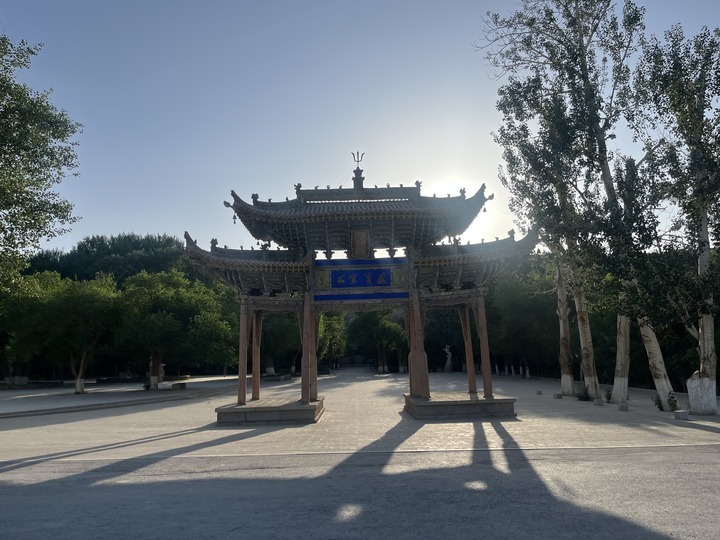大牌坊是莫高窟另一处标志性景观。要进入莫高窟窟区,首先得经过这座庄重质朴、飞檐翘角的牌坊。牌坊匾额东面是“石室宝藏”,西面是“三危揽胜”,夕阳西下时,更显古韵。